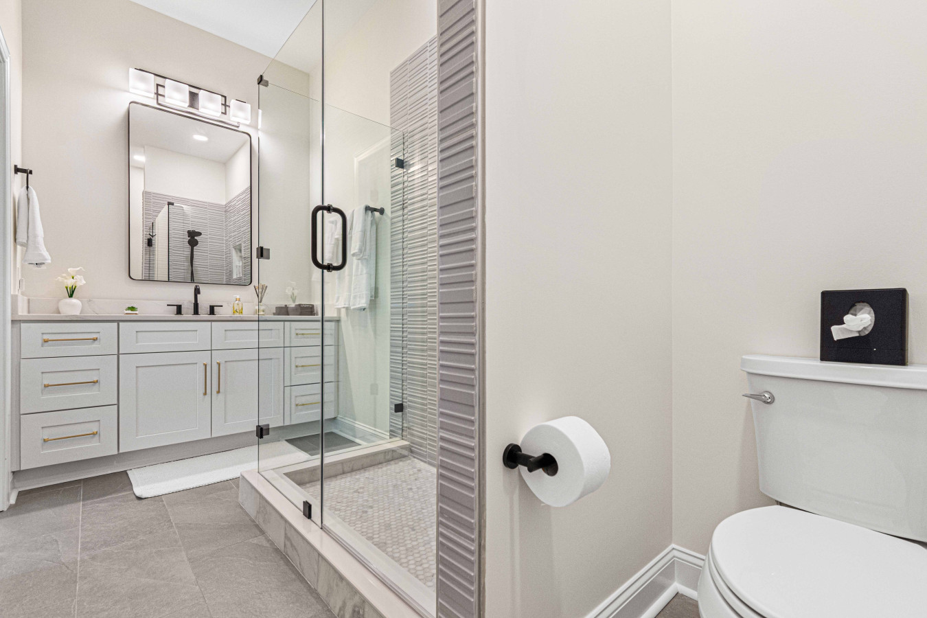 ✹ Bathroom 1: Ensuite to Primary Suite w/ Huge Dual-head Shower, Tub, Walk-In Closet, and Double Vanities