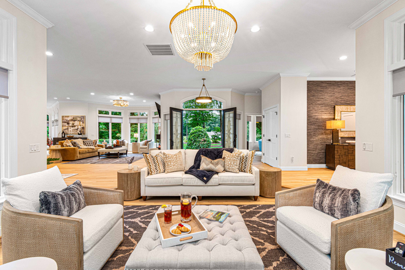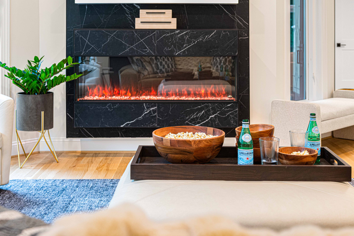 The living room is the gathering spot for the family with large glass windows showcasing the beautiful landscape. With it's expansive design fireplace, this spot is ideal for sharing quality time. For entertainment, the room features a large TV and an electronic fireplace.