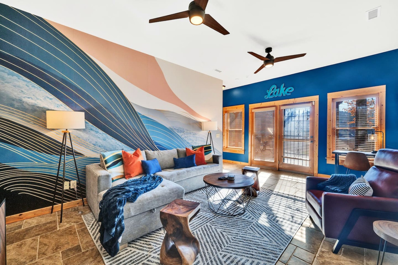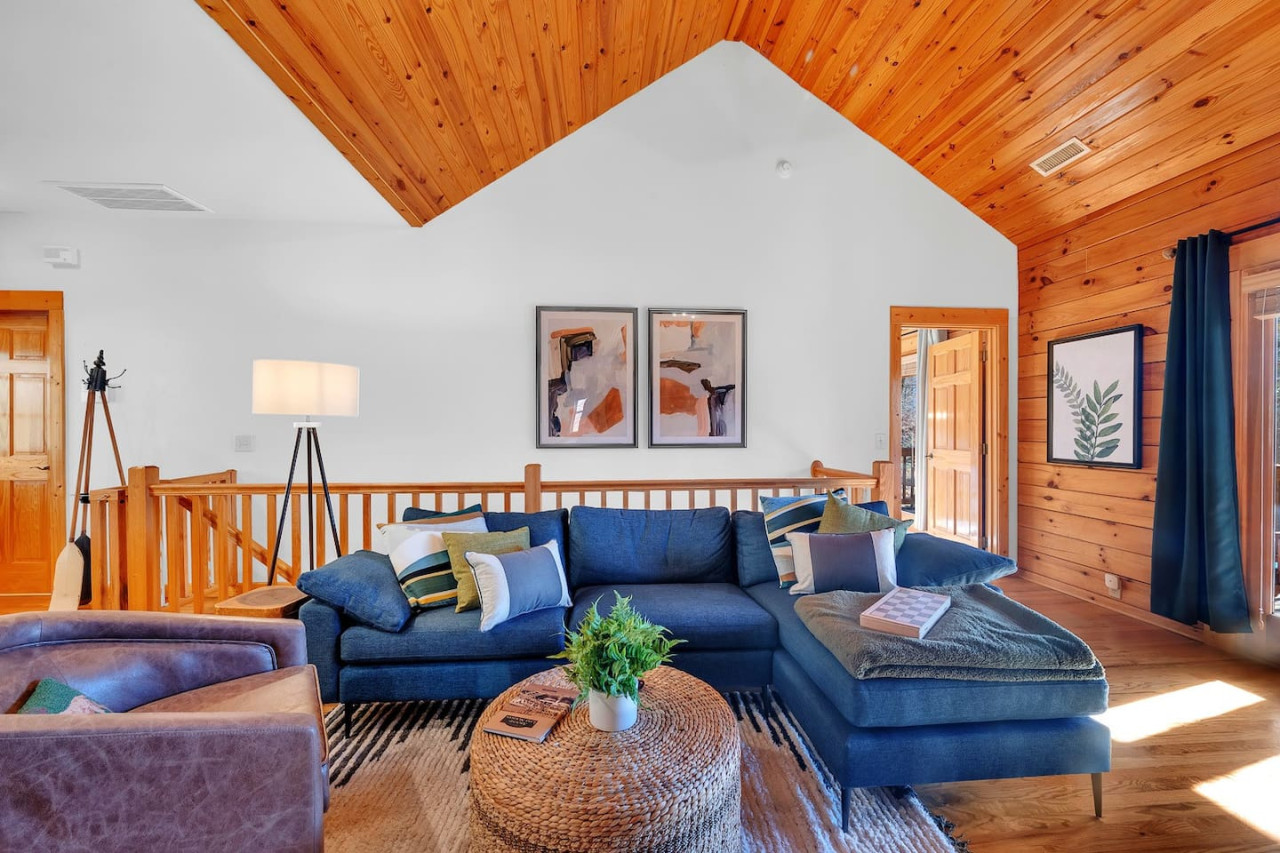 The great room features gorgeous exposed wood ceilings and walls and large windows with beautiful views of the lake. For entertainment, each living room features a flat-screen TV and a variety of board games for some quality family bonding. Both levels boast cushy sectional sofas from Article that can pull out into sleeper sofas.