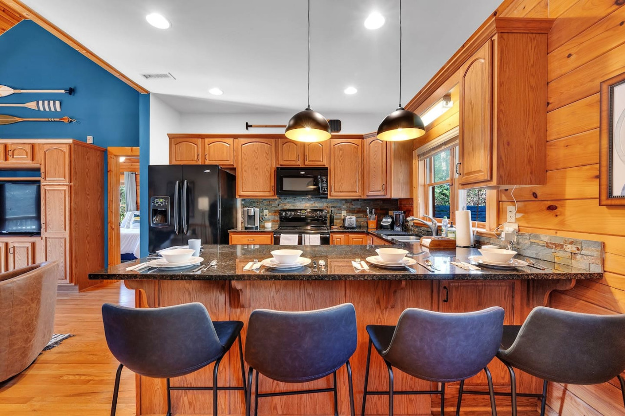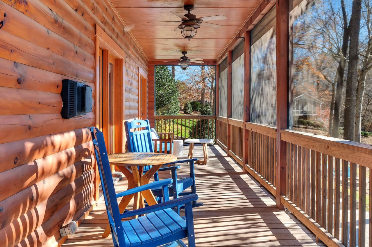 Imagine your family escaping to a cozy log cabin perched on a more secluded portion of Lake Norman, where tranquility meets comfort. As the sun rises, your day begins with a warm cup of coffee on the screened-in porch, embraced by soft, plush furniture and gentle lake breezes. The kids are already planning their day: a morning paddle on the lake with kayaks and stand-up paddleboards, followed by an afternoon exploring nearby attractions. Inside, the cabin's spacious living rooms, adorned with large flat-screen TVs and inviting sofas, offer a perfect spot for family movie time, while the fully equipped kitchens beckon the chef in your family to prepare a delicious lakeside meal.
