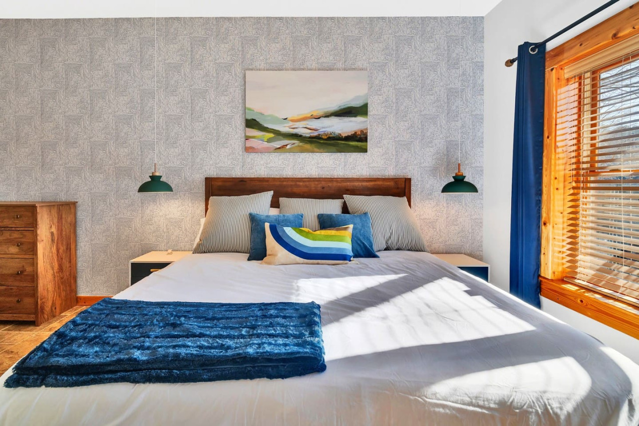 ✹ Main Level Primary Bedroom: King-sized Bed, Ensuite Bathroom