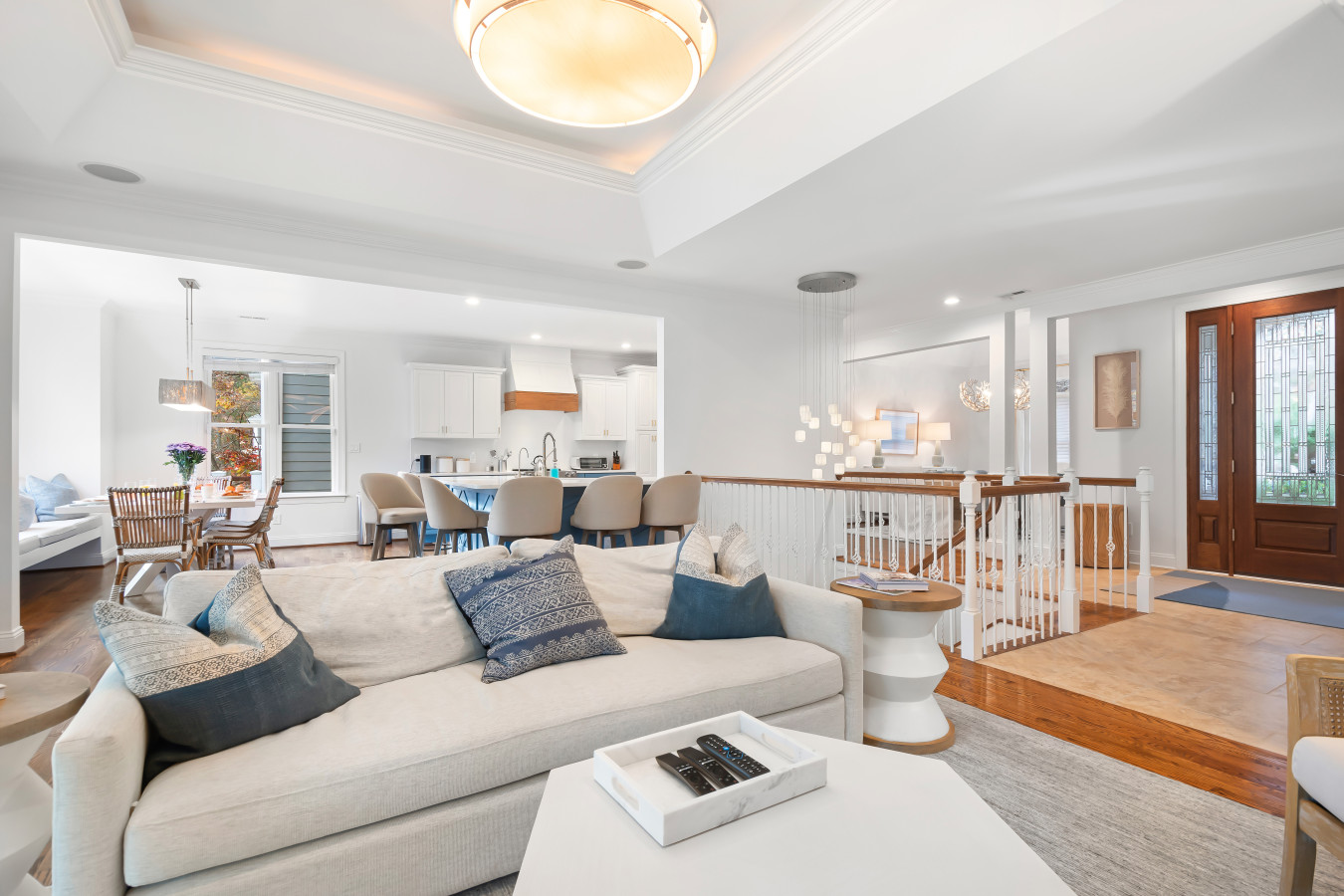 The living room is the gathering spot for the family with large glass windows showcasing the views of the lake. With it's expansive design and gorgeous exposed wood beams, this spot is ideal for sharing quality time. For entertainment, the room features a large TV with several content subscriptions ready to go.