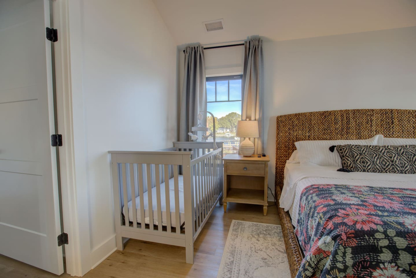 ✹ Bedroom 1: Upper-Level Primary Bedroom with King-sized Bed, Crib, Ensuite Bathroom, Walk-in Closet